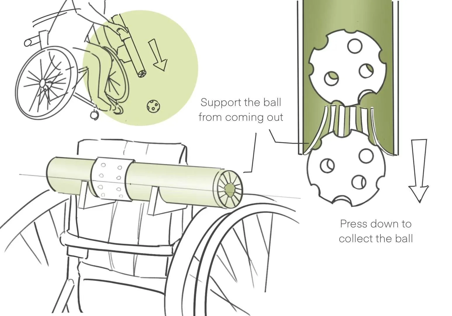 A ball collection + storage system designed for wheelchair pickleball players.