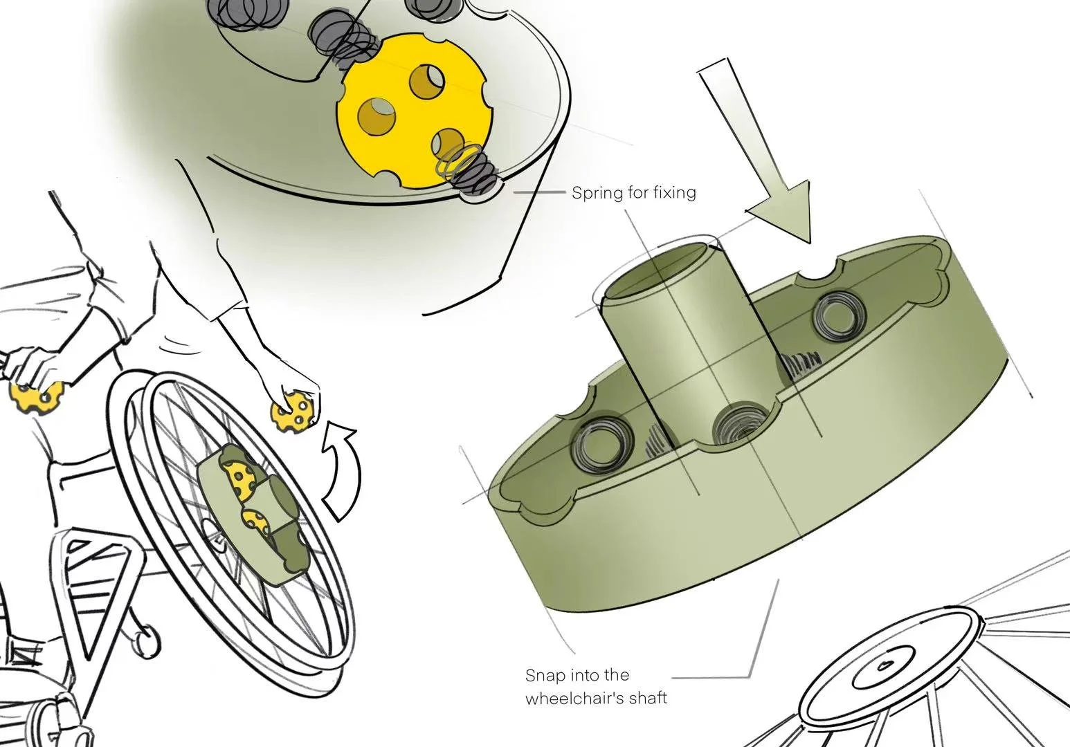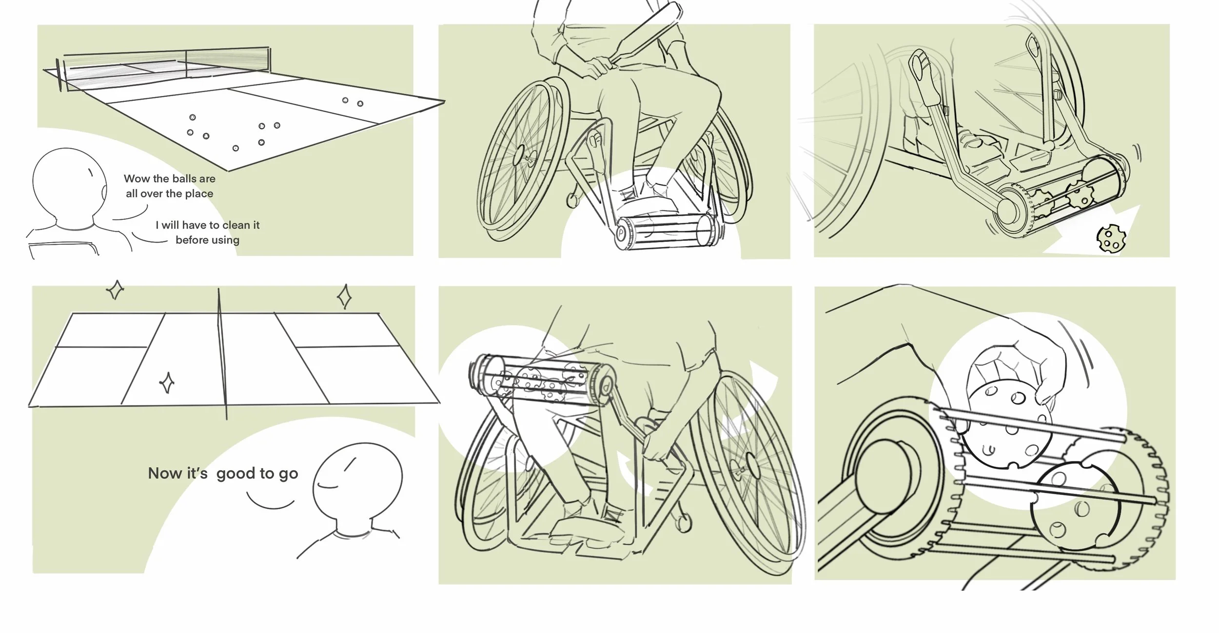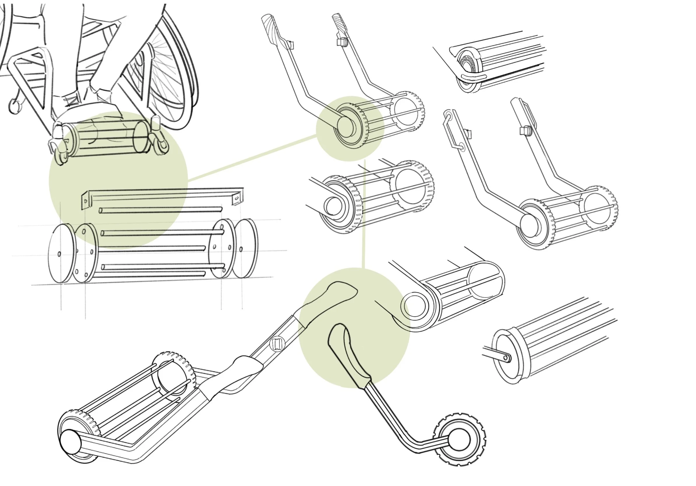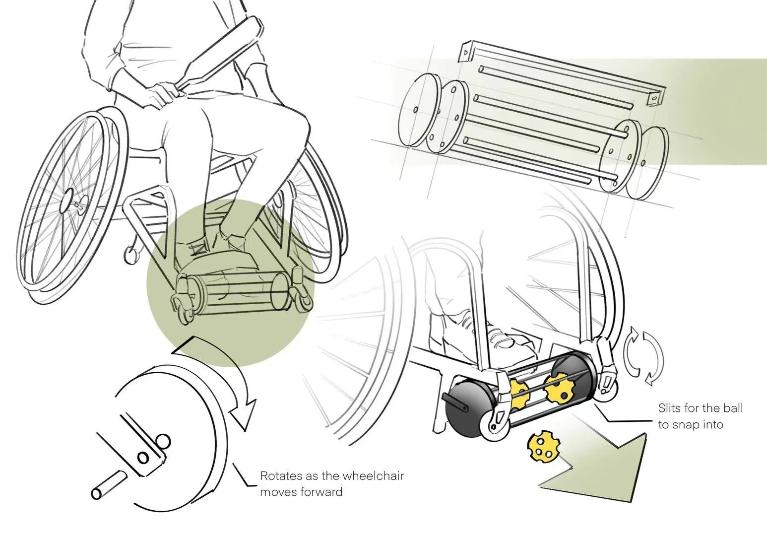 Early sketches explored different ways to integrate the picker with the wheelchair: front-foot rollers, rear tubes, and side-mounted arms. I focused on how the player’s natural motions—rolling forward, turning, backing up—could become the main “input” instead of asking them to bend down.