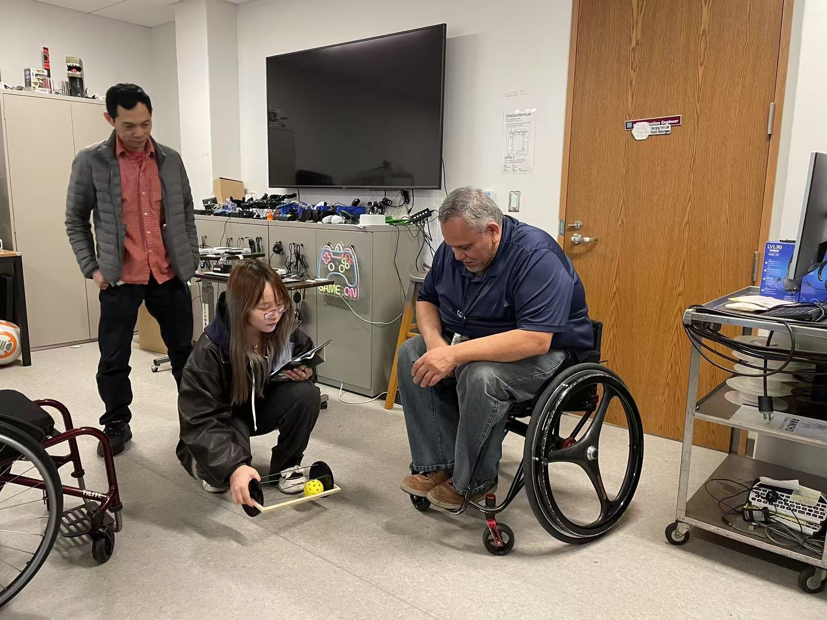 Existing ball retrieval tools are designed for standing players and are hard to use from a wheelchair.