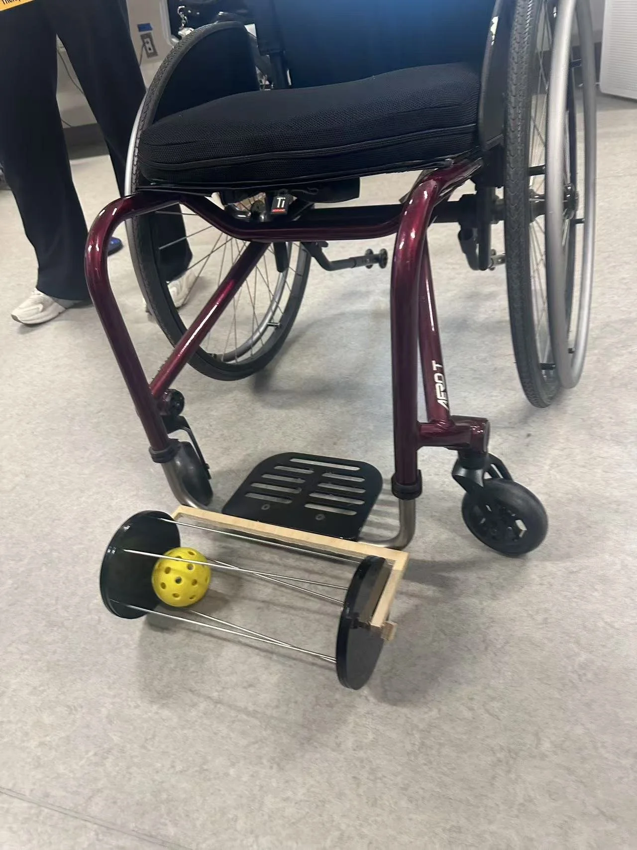 PickPal is a foot-mounted ball picker for wheelchair pickleball. A set of rollers under the player’s feet collects balls as they roll forward, guiding them into a dedicated storage area on the chair. This reduces bending, keeps the court clear, and makes the picker feel like a natural part of the sports wheelchair.